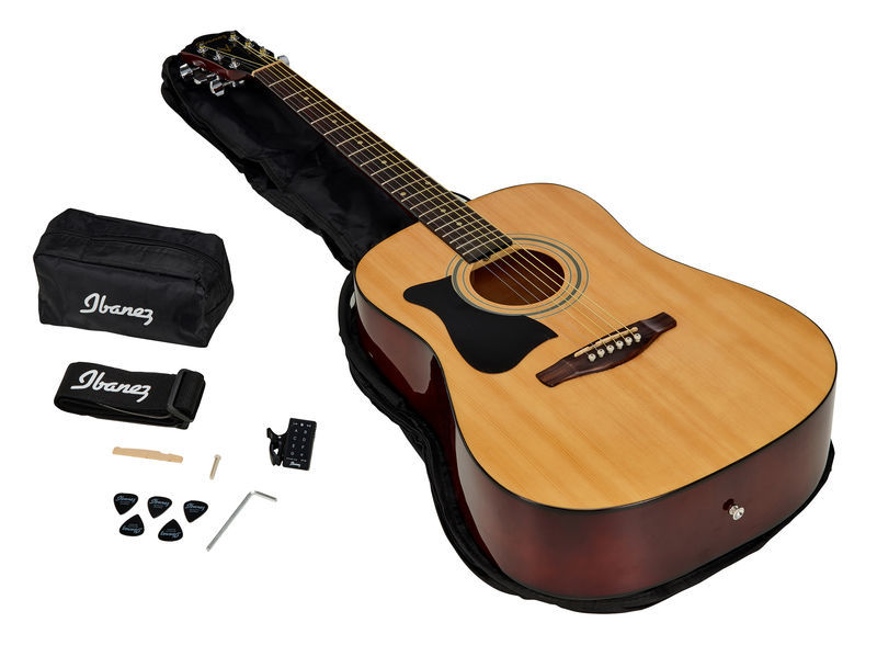 Ibanez V50NLJP-NT Jam Pack, Steel-String Guitar Set, Left-handed model, Top: Spruce, Fretboard: Nandu, Fretboard inlays: Pearl dot, Machine heads: Enclosed, Colour: Natural, Includes a tuner, gig bag, strap, picks and accessory bag