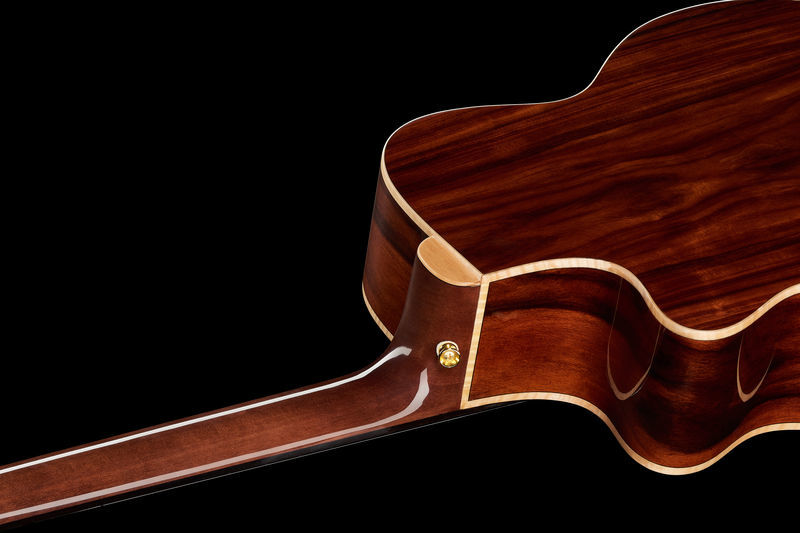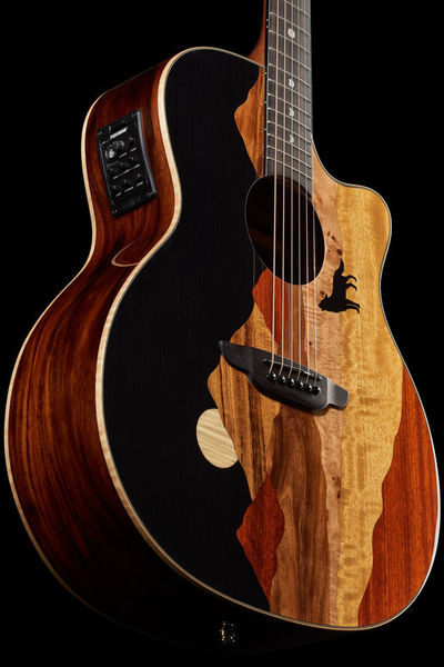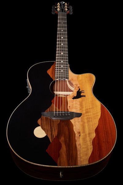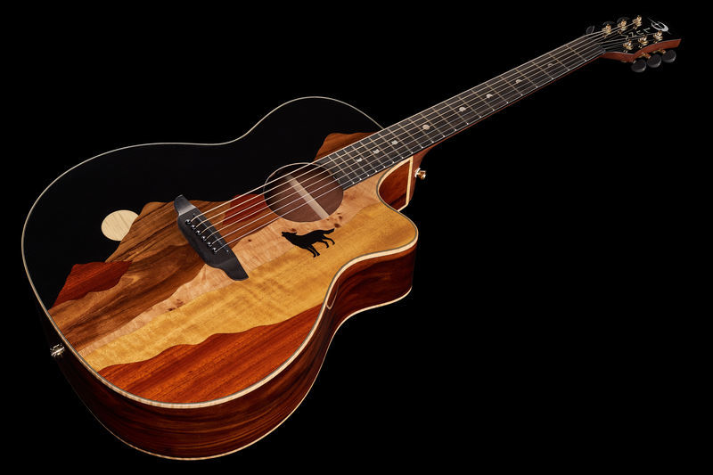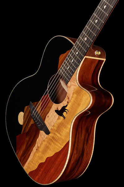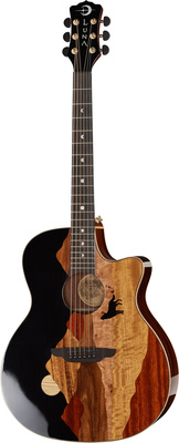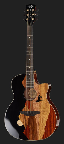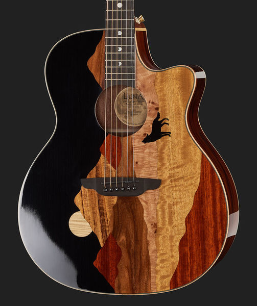 " Luna Guitars Vista Wolf LTD, Acoustic Guitar with Pickup, Style: Grand Auditorium with cutaway, Top: Padauk, birdseye maple, koa and curly maple, Back and sides: Koa, Mahogany neck, Ebony fretboard and bridge, ""Moon Phase"" fretboard inlays, 20 Frets, Bone nut, Nut width: 42,9 mm, Scale length: 648 mm, Piezo pickup with Fishman Presys+ (PSY-201) preamp, Colour: Hi-Gloss natural, Includes case"
