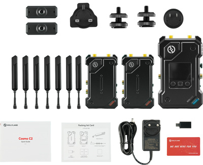 Hollyland Cosmo C2 2TX & 1RX, Wireless Video System@+Set consists of two Cosmo C2 wireless video transmitters and one Cosmo C2 wireless video receiver, Transmission range: up to 1000 m (line of sight), Latency: 33 ms, Operating frequency: 5.15 - 5.85 GHz, Bandwidth: 40 MHz, Supports seamless frequency hopping, Supports NDI, UVC and RTMP-Streaming, Offers HDMI and SDI ports, Resolution (HDMI input/output & SDI input/output): 720p50 / 59.94 / 60, 1080i50 / 59.94 / 60, 1080p23.98 / 24 / 25 / 29.97 / 30, 1080p50 / 59.94 / 60, Ports transmitter: DC input, 2.0 mm core socket, HDMI input: HDMI 1.4b, DSI input: 3G SDI, SDI loopout: £G SDI, USB-C: USB 2.0 OTG, Antenna: SMA male, Ports receiver: DC input, 2.0 mm core socket, HDMI output: 2x HDMI 1.4b, SDI output: 2x 3G SDI, USB-C: USB 2.0 OTG, Antenna: SMA male, Ethernet: RJ45, 100 Mbps, Transmitter dimensions (W x H x D): 115 x 69 x 36 mm, Receiver dimensions (W x H x D): 142 x 87 x 33 mm, Transmitter weight: 210 g, Receiver weight: 440 g, Includes 7x blade antennas, 1x 12 V / 2 A DC power adapter, 1x USB-C OTG adapter, 2x cold shoes and 1x carrying case