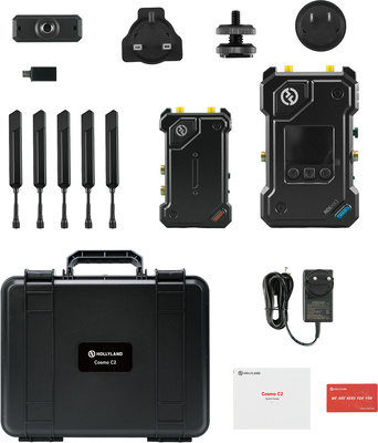 Hollyland Cosmo C2 1TX & 1RX, Wireless Video System@+*Set consisting of a Cosmo C2 wireless video transmitter and a Cosmo C2 wireless video receiver*, Transmission range: up to 1000 m (line of sight), Latency: 33 ms, Operating frequency: 5.15 - 5.85 GHz, Bandwidth: 40 MHz, Supports seamless frequency hopping, Supports NDI, UVC and RTMP-Streaming, Offers HDMI and SDI ports, Resolution (HDMI input/output & SDI input/output): 720p50 / 59.94 / 60, 1080i50 / 59.94 / 60, 1080p23.98 / 24 / 25 / 29.97 / 30, 1080p50 / 59.94 / 60, Ports transmitter: DC input, 2.0 mm core socket, HDMI input: HDMI 1.4b, DSI input: 3G SDI, SDI loopout: £G SDI, USB-C: USB 2.0 OTG, Antenna: SMA male, Ports receiver: DC input, 2.0 mm core socket, HDMI output: 2x HDMI 1.4b, SDI output: 2x 3G SDI, USB-C: USB 2.0 OTG, Antenna: SMA male, Ethernet: RJ45, 100 Mbps, Transmitter dimensions (W x H x D): 115 x 69 x 36 mm, Receiver dimensions (W x H x D): 142 x 87 x 33 mm, Transmitter weight: 210 g, Receiver weight: 440 g, Includes 5x blade antennas, 1x 12 V / 2 A DC power adapter, 1x USB-C OTG adapter and 1x cold shoe